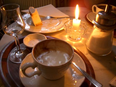 Ich bevorzuge dazu Orangenlikör, der in einem Extraglas kommt, rühre ihn aber immer gleich mit rein. Den Sahneklecks, der ebenfalls separat serviert wird, vorsichtig obendrauf gleiten lassen, ja, ganz behutsam, sehr gut! So, und nun Schluß mit der Vorfreude, nun muß man tapfer sein und gute Vorsätze gute Vorsätze sein lassen. Denken Sie daran: Da draußen lauert das Schmuddelwetter, da braucht das Immunsystem ja schließlich Verbündete, nicht wahr?
